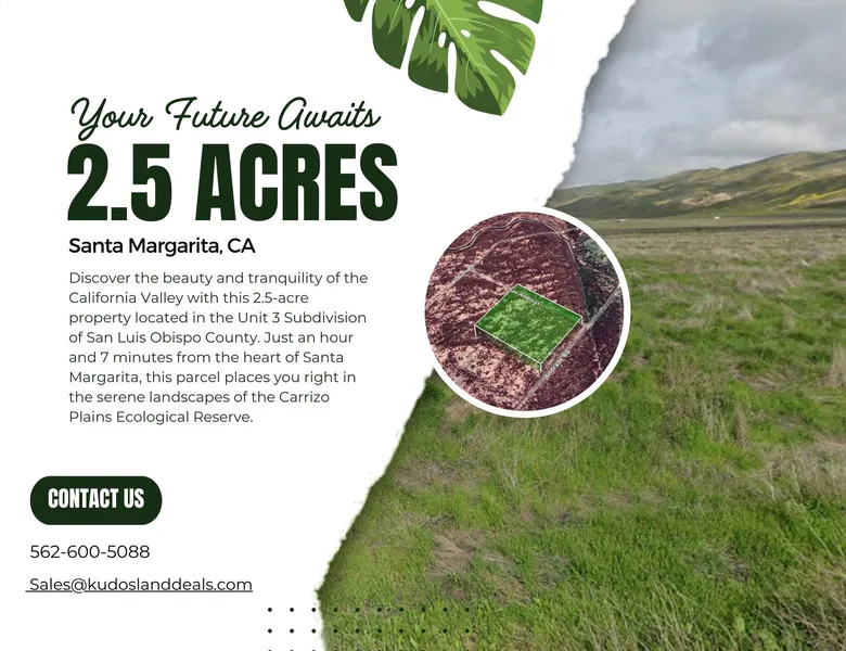 Discover the beauty and tranquility of the California Valley with this 2.5-acre property located in San Luis Obispo County. Just an hour and 7 minutes from the heart of Santa Margarita, this parcel places you right in the serene landscapes of the Carrizo Plains Ecological Reserve.