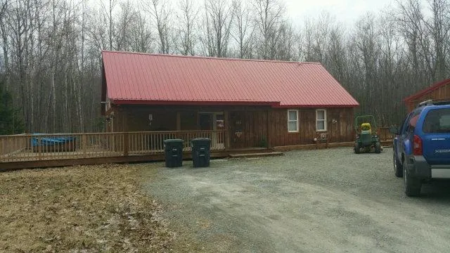 Knotty pine cabin style home, loft bedroom up w/1/2 bath. Two decks, 2 garages, privacy galore. Cathedral ceiling in the great room. Pond on property. This is a house to get away from it all. Hot tub on front deck stays. Pellet stove for additional heat. Must see to appreciate!