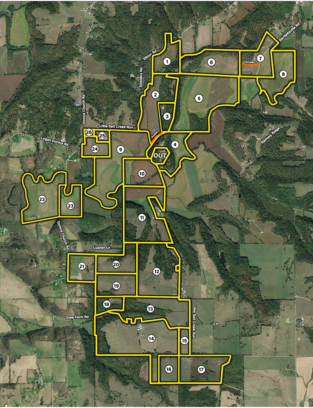 TRACTS 4-8: Features almost 400-contiguous acres including approximately 242+/- tillable acres with Stendal, Haymond, and McGary as predominant soil types. The large 150-acre field in Tract 5 is a SWING tract, to be combined only with Tracts 1,2,3,4, or 6 or an adjoining property owner. Tract 6 includes access through Tract 7 off of Bartlettsville Road.
