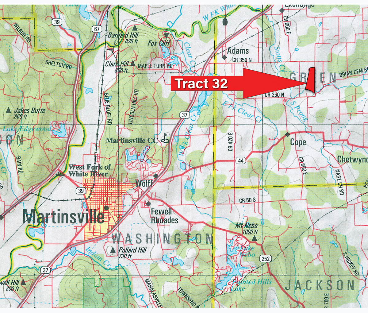 Tracts 1-26: Located 9-miles northeast of Bedford and 20-miles south of Bloomington, these tracts are accessed via Bartlettsville Road along the East, Ozee Farm Road to the South, and Donica Church Road to the West, and Little Salt Creek Run through the central portion of the tracts. GPS LOCATOR TO CENTER: 38.955270, -86.466495