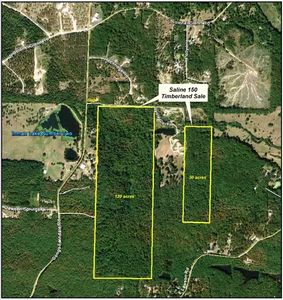 Boundary - W1/2 NW1/4, NW1/4 SW1/4 and 30 acres Part of the E1/2 E1/2 NW1/4 all in Section 13, Township 1 North and Range 15 West Saline County, Arkansas being 150 acres, more or less. All boundaries in white RFC flagging. No Survey provided.