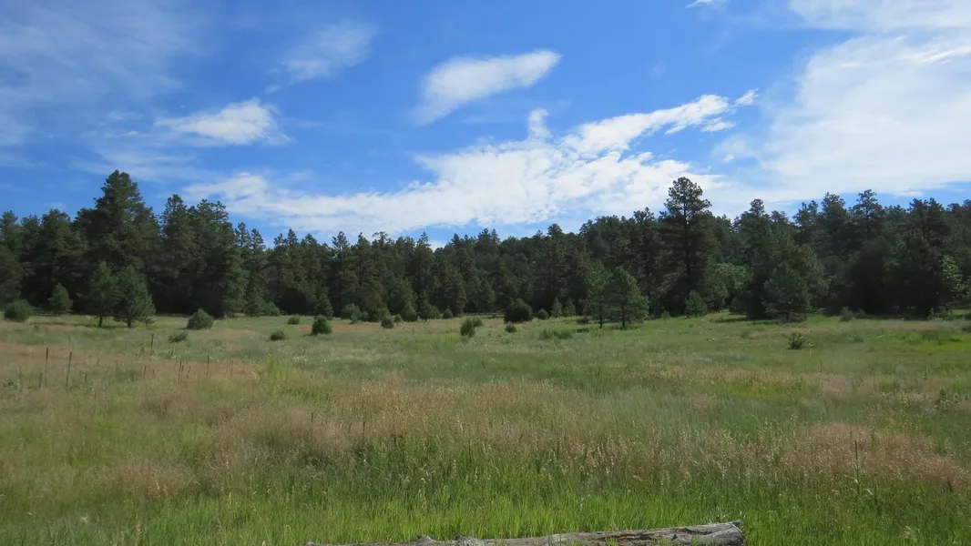Property is covered is tall Ponderosa pines with a large open meadow and many rock outcrops.