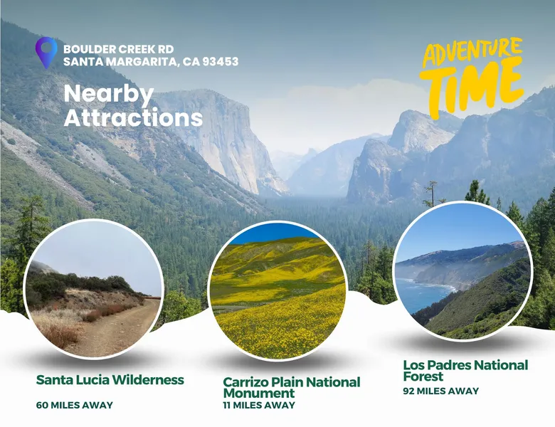 Premium location, close to Seven Mile Road. Escape to the serene landscapes of California Valley, a rural land suburb of Santa Margarita, CA and claim your slice of paradise on this expansive 2.5-acre property located on Boulder Creek Rd. Surrounded by breathtaking natural beauty and just 21 minutes from the majestic Carrizo Plain National Monument, this vacant land offers the perfect canvas for your ideal getaway.