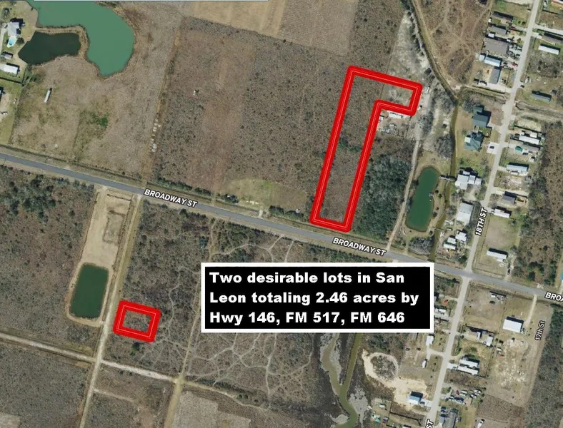 This listing is for two desirable tracts totaling 2.46 acres (North tract on Broadway Street & South tract off Broadway Street) in San Leon by Hwy 146, FM 517 & FM 646. The Seller will not subdivide. San Leon is known as a quaint fishing town just east of Dickinson. The town is in a growing area that is becoming a popular tourist destination. The North tract is 93,800 square feet (2.15 acres) consisting of 14 lots with ~134 Feet of Road Frontage on Broadway. Per San Leon MUD, the North tract has a 10" water main that is available for development, but does not have any sewer available. The Buyer would need to install a septic system. The South tract is 13,400 square feet (0.3076 Acres) consisting of 4 lots & is off Broadway Street. The South tract is also in San Leon MUD, but has no sewer or water. No surveys are available. These two tracts totaling 18 Lots are 11 miles South of the Future Grand Parkway/TX-99 which will cross I-45 at FM 646 when completed (see map). Seller Retains All Owned Minerals.