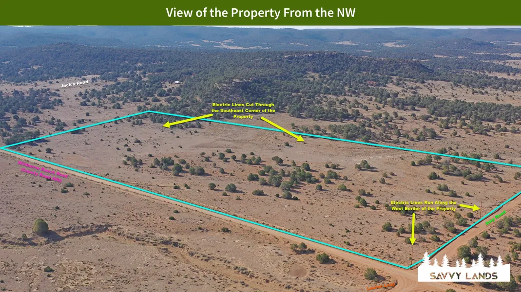 Power: Power lines run along the southern and western borders of the property and cut through the southeast corner of the property.
