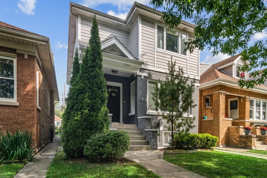 Classic brick bungalow converted to modern two story luxury single family on an oversized lot tucked away on a tree lined street in Portage Park! 5 bed 3.1 bath with modern open floor plan bathed in sunlight from large windows. Hardwood floors throughout the main floor and second floor. Modern kitchen with quartz countertops and waterfall island, stainless steel appliances and soft close cabinets. Spacious living and dining room on the main floor with gas fireplace and coffered ceilings. Powder room, custom built mud room area, and bedroom off the kitchen perfect for an office or playroom. Beautifully crafted switchback stairs lead up to the second floor and basement. Second floor features a beautiful primary bedroom at the back of the house with tray ceilings, custom built walk-in closet, and spa like en suite primary bath with large shower and double vanity. Directly off the primary, there is a large laundry room, followed by two additional bedrooms with walk-in closets, plus a bonus loft area perfect for another office space as well as a full second bathroom. Extremely cozy full finished walk-out basement, full wet bar equipped with beverage fridge, wine rack, and more storage. Another bedroom and large 3rd bathroom with linen closet. Two high efficiency furnaces, 200 amp electrical service. Drain tile, sump pump with battery back up and separate utility/storage rooms and fifth bedroom complete the basement. Professionally landscaped backyard with artificial turf and stone pavers. Large 2.5 car garage. Short walk to Portage Park!