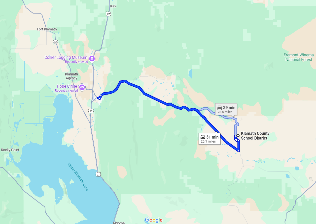Landmarks: Crater Lake National Park, Williamson River, and Fremont-Winema National Forest.