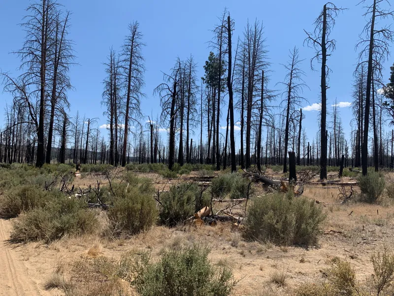 Terrain is relatively flat. Soil is mixed loam and sand. Vegetation is sage brush, grass, burnt and healthy pine trees.