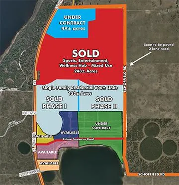 There has been massive activity on the property that will benefit the rest of the remaining parcels. At this time, we have closed on the Phase I of a 150+/- acre contract to Hanover Family Builders (Phase I closed end of December 2018, Phase II set to close in 2020). In addition to that, 243+/- acres have been sold to Olympus Sports & Entertainment on June 21st, 2019. This project is a major professional sports training, wellness and recreational facility. The addition of Olympus to this site will have enormous impacts on value and marketability of the remaining parcels. In addition, it is estimated that Olympus will create approximately 6,000 jobs and $1.4 billion in economic impacts to the region over a 10 year period. This facility will host amateur and professional athletes from around the world and will be broadcast ready. a mix of multifamily and townhome units, more than 1,000 hotel rooms, about 860,000 square feet of retail and office space, and nine sport and civic venues equipped for showcasing a variety of traditional and non-traditional sport matches like those seen within the emerging online video game esport industry.