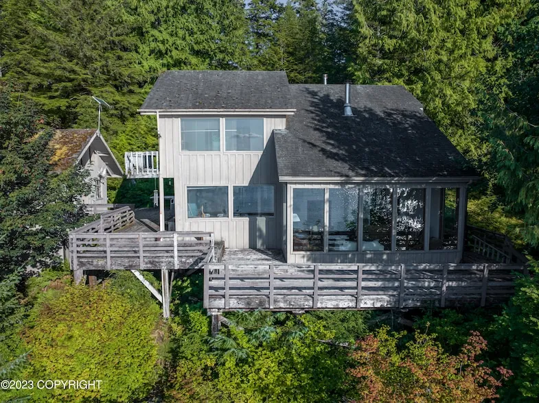 Explore this west-facing oceanfront estate comprised of two contiguous parcels in the serene Clover Passage area with 332 feet of ocean frontage and spanning 2.17 acres of land across from Stack Island.A secluded location, it is accessible by a 20 min boat ride from Knudson Cove. Offered with furnishings and goods onsite as a canvas for realizing your vision of a tranquil waterfront homeor development into a lodge experience. Explore the potential of this remarkable property and seize the opportunity to create a haven for guests seeking an immersive wilderness experience. Featuring custom-built structures, including a two-story 1854 sq ft main residence, this off-grid property showcases abundant natural light, high ceilings, and custom picture windows framing panoramic views. The interior layout integrates various living spaces, including 3 bedrooms, 2 living rooms, a spacious kitchen & dining area, and a bathroom with tub/shower. Equipped with three wood stoves, on-demand hot water, a propane stove/oven, and a rain catchment/cistern water system, the home offers self-sufficiency. It is wired for electricity and powered by a generator and battery bank. Envision the addition of a dock, taking advantage of the depth of the water in front of the property providing convenient access for boating, fishing, and all water activities. As a unique bonus, enjoy access to local sawdust walking trails, further enhancing the outdoor experience.