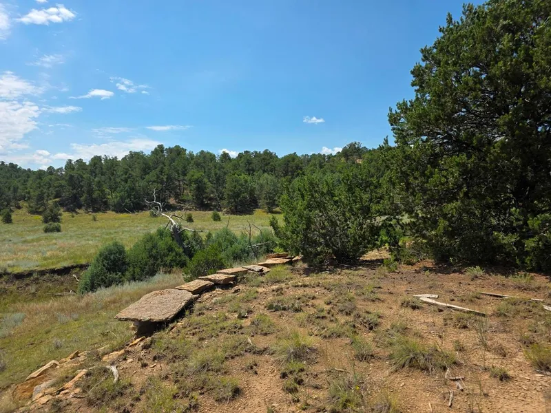 Long gravel driveway takes you way back into this off grid property where you'll find a perfect campsite with ideal southern exposure and complete views of Fishers Peak and the Raton Mesa.