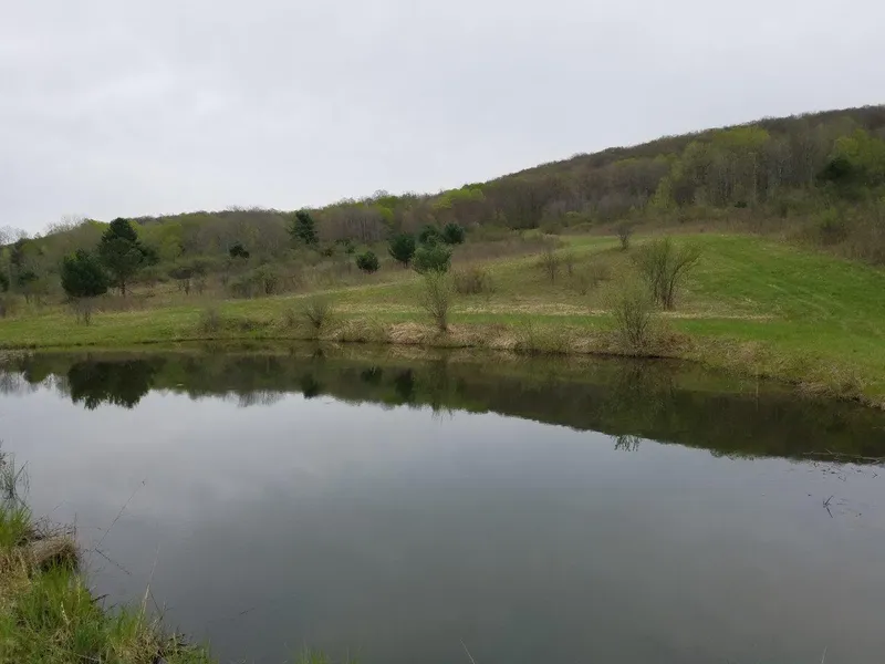 The low lying brushy meadow features apple trees, mowed plots, trails, and a pond. Trails meander throughout the meadow and the timber filled hillside. Scattered pines, golden rod, and young growth throughout the meadow provide great deer cover with plenty of room to expand the existing food plots.