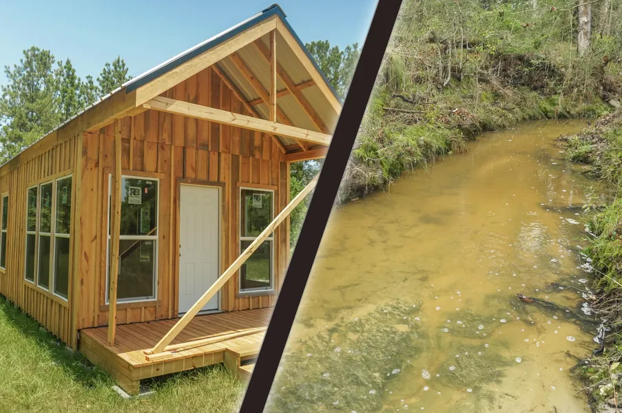 The 420 square foot, modern concept, dried-in cabin compliments the rolling field landscape perfectly. The cabin is situated directly off the creek bank by a small rock waterfall under a massive oak over-story, providing a truly serene setting. The cabin interior was purposefully left unfinished, providing the opportunity for the future owner to realize their own style and to satisfy their own budget.