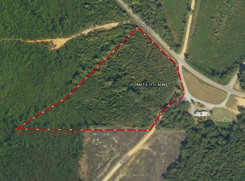 The Tract is located in the quaint "Whites Chapel" Community with excellent access in an area of two of the better school systems in the State. Tract 3 offers vista views with corner access adjacent to White Springs Church and an accomodating year-round water access via a tribuary of "Stewarts Creek" providing a homestead opportunity. The property is surrounded by mostly large landowners and is a safe-haven for wildlife. The "Corner Tract" is a perfect place for a custom build, starter home, trailer and/or RV.