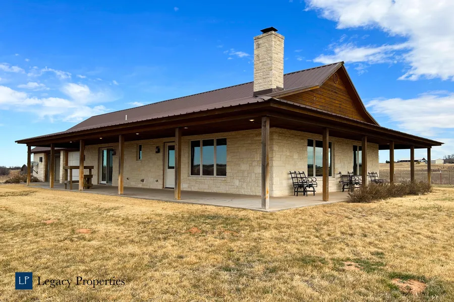 The exterior is Austin stone, with cedar overhangs and eaves. Three sides of the house have a wrap around porch, allowing you take in views from any side. The roof is metal. The flowerbeds are nicely landscaped, and the the lawn has irrigated zoysia grass.
