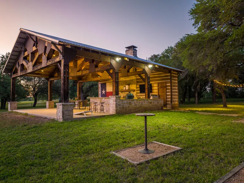 A stunning covered pavilion with LED lights, walk-up bar, grill, fireplace, heaters, and breathtaking views is a dream space for entertaining guests or watching a ball game. Its a perfect blend of comfort, style, and functionality, providing an ideal setting for outdoor gatherings and creating cherished memories with loved ones. The panoramic view of the distant hilltops adds to the pavilions charm, offering breathtaking vistas that are perfect for enjoying sunsets or stargazing. Its a picturesque backdrop that enhances the overall ambiance of the pavilion and creates a serene and tranquil environment for relaxation and entertainment.