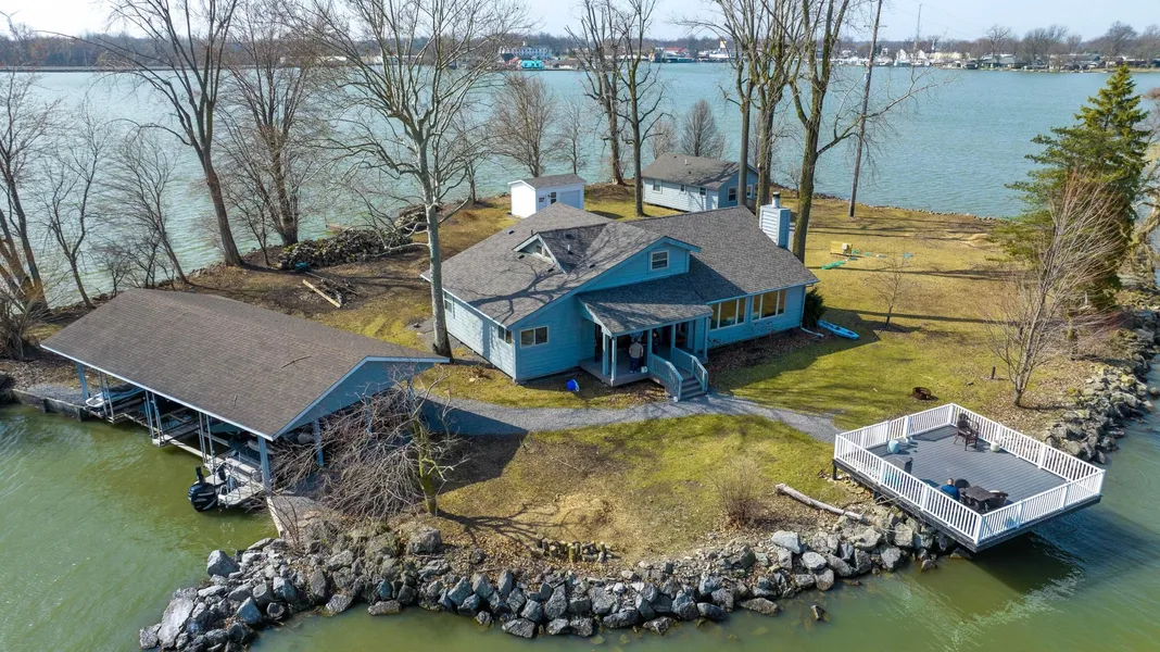 PRIVATE ISLAND!! STUNNING, COMPLETE RENOVATION - GUTTED TO THE STUDS & REBUILT WITH LUXURY FINISHES THROUGHOUT. This unique waterfront property features 2 fully renovated, fully furnished homes on nearly 1 acre of prime lakefront. Every surface, system, and finish has been upgraded to the highest standards, including all-new electrical, plumbing, HVAC, roof, windows, insulation, septic, water filtration system and more. The main house offers 5BR/3BA with an open-concept layout, flooded with natural light and anchored by a designer kitchen featuring a massive oversized island perfect for entertaining. The charming 640 sqft cottage adds 2BR/1BA-ideal for guests, in-laws, or rental income. Combined, the homes comfortably sleep up to 22 people. Step outside to enjoy your own waterfront oasis complete with a covered boat dock with 4 electric lifts, fishing dock, storage shed, new hot tub, and sweeping sunset views. Whether you're seeking a dream residence, a luxurious vacation getaway, or a proven income-producing rental, this turn-key property delivers unmatched quality and flexibility. Too many updates to list-this is a must-see! Move in today or start generating rental income tomorrow.