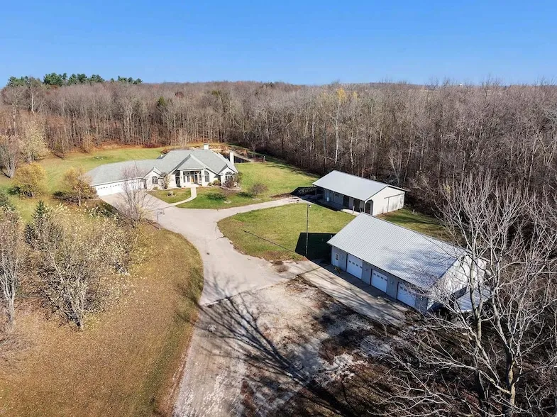 Sprawling custom built all brick ranch home featuring a relaxing patio w/firepit, Above ground pool with deck, 3 car attached heated garage w/basement access, 40x52 outbuilding w/full bath & workshop area, 3 stall 32x50 horse barn situated on 20 quiet country acres wooded for privacy. Open concept great room w/fireplace. Applianced kitchen w/hardwood floor & walk-in pantry, adjoining dining area w/door to patio, formal dining room & main level office or den. Primary bedroom w/lighted tray ceiling, fireplace, dual walk-in closets & private full bath w/jetted tub & step-in shower. 1st floor laundry. Full finished LL w/family room, game, room, exercise area, bedroom & full bath.