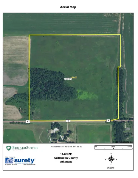 40 Acres located in Crittenden County Arkansas. The farm has 34 cropland acres with a 17.7 acre Generic base, 4 acre wheat base, 12.5 acre soybean base. Located on Smokey Alley road. The soil types are 66% Alligator silty clay and 33% Sharkey silty clay.