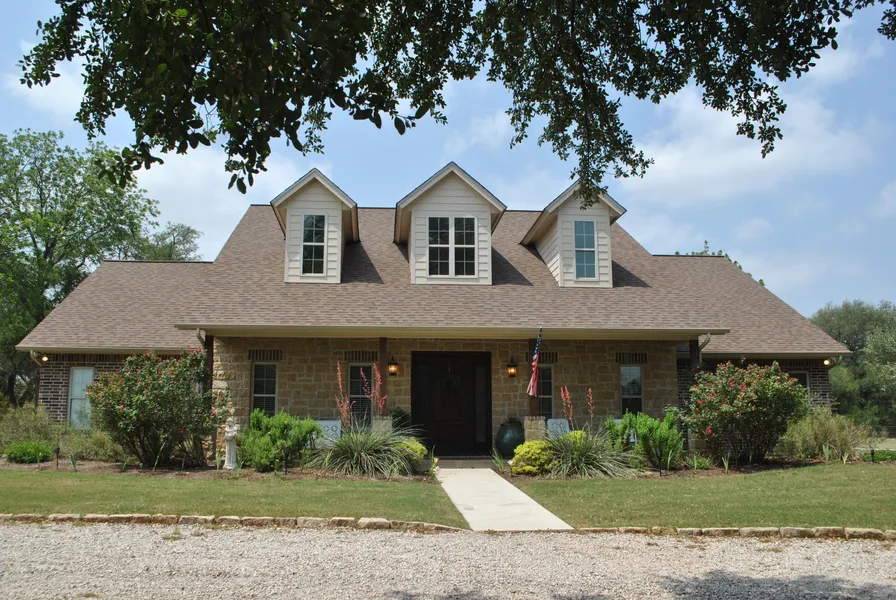 It's a dream come true.... and this property is waiting for you! You will love this spacious custom built home. 3553 sq ft, five bedrooms, the master suite is downstairs with three more bedrooms, and upstairs features a living room or game room with one bedroom and bathroom . Beautiful kitchen opening up to living and dining featuring granite counter tops, stainless appliances, custom cabinetry and two dining areas giving you all the room you need for entertaining family and friends. Living room has a gas fireplace, perfect to cuddle by when winter winds blow. Energy efficient Geothermal HVAC system. This 56.85 acre ranch with new fences, perfect for any livestock, large stock tank, two water wells, one new well is solar powered. Abundant wildlife in the area for the hunters in the family. Majestic live oaks surround the house engulfing it in a wonderful shade. For added bonus this property is on a FM road just minutes from town. Call us today!