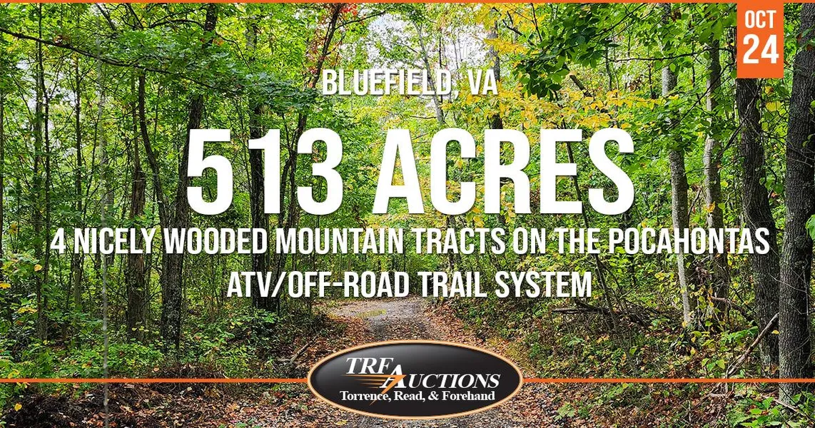 513 wooded acres in Tazewell County, VA will be offered at auction in 4 tracts ranging from 100143 acres each, or as a whole, on Friday, October 24, 2025 at 12:30 PM. Located on Franklin Rd just 1.5 miles north of Abbs Valley on the VA/WV border, this mountain property features hardwood timber, creeks, distant views, excellent roads and trails, and is ideal for hunting, off-roading, timber, or a private retreat. Features direct access to over 400 miles of trails along the Pocahontas Trail system for the AV/of-road enthusiast. Consisting of 15 tax parcels offered in 4 tracts from 100 acres to 143 acres and as a whole