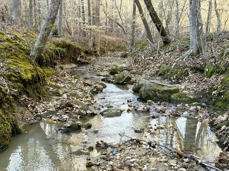 About 11 acres of mixed hardwood forest surround a small stream that flows across the back side of the land. This area ranges from flat creek bottom to steep hillside. Trees include yellow poplar, oaks, maples, and American beech. Some hardwoods are old and large. Patches of native pines are mixed in near the back property line.