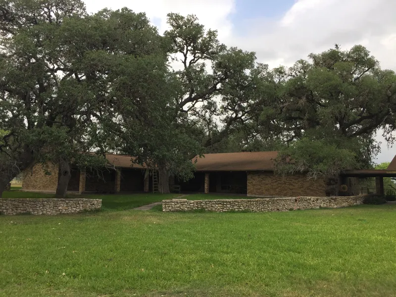 Beautiful home on this ranch is surrounded by huge oak trees. This 4-bedroom house was built by Louis Kosse. It has approximately 4,300 sq. ft. under roof. The large game room with a big fireplace is perfect for entertaining. Other improvements include a new equipment barn, cattle pens, and dog kennels.