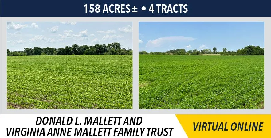 The Mallett farm will be sold on a price per acre basis, based on the surveyed acres. Tracts 1-3 will be offered through the marketing method of Buyers Choice, whereas the high bidder can elect any of the tracts for their high bid. If the high bidder does not elect all offered tracts, then the remaining tract(s) will continue to be offered Buyers Choice until all 3 tracts have been elected. Tract 4 will be sold for a lump sum total dollar amount. The tracts will NOT be offered together or in any combination at the conclusion of the auction.