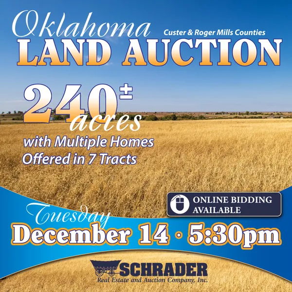 An exciting opportunity to purchase quality pasture, homes and potential building sites in Custer and Roger Mills Counties. The auction consists of 3 separate properties, all near the community of Carpenter, Oklahoma. Tracts 1 through 4 offer some stunning views of the surrounding landscape, have good perimeter fencing and offer frontage on county roads. Tracts 5 and 6 make up 160+/- acres total, including: a great pond, good fences, county road frontage and a 1,080 square foot, 3 bed, 1 bath ranch house in good repair. Tract 7 features a 2,163 square foot, 2 bed, 2 bath, 2 living area home located along Highway 34! Buyers may bid on any individual tract or combination of tracts that best fit their needs.