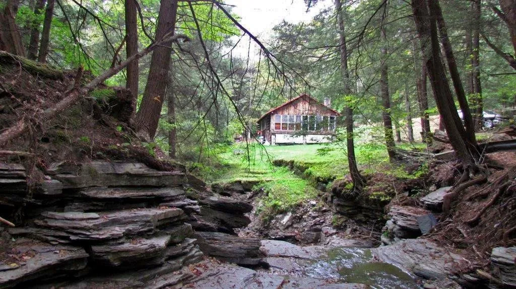 Private retreat Waterfall Lodge is an off-grid cabin on 245 acres timberland, stream with waterfalls, and a pond in Harford NY, Cortland County.