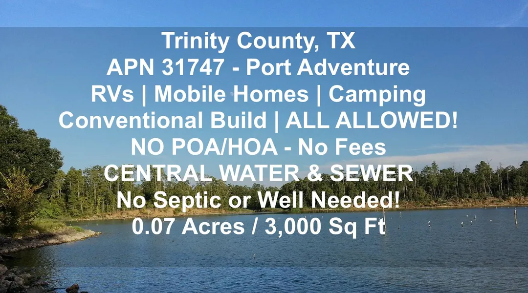 Gorgeous lot in Port Adventure right at the top of Lake Livingston with access to city utilities ready for meter installation at the road including Power, Water, and Sewer. No POA/HOA to worry about! No fees!