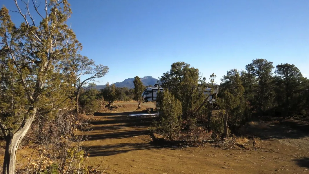 Finished driveway takes you into the parcel from the private ranch cul de sac road and leads to a great camping or future build site. Electric pedestal and leased propane tank are both in place and service a 2021 5th Wheel Dutchmen ASTORIA PLATINUM 3173RLP