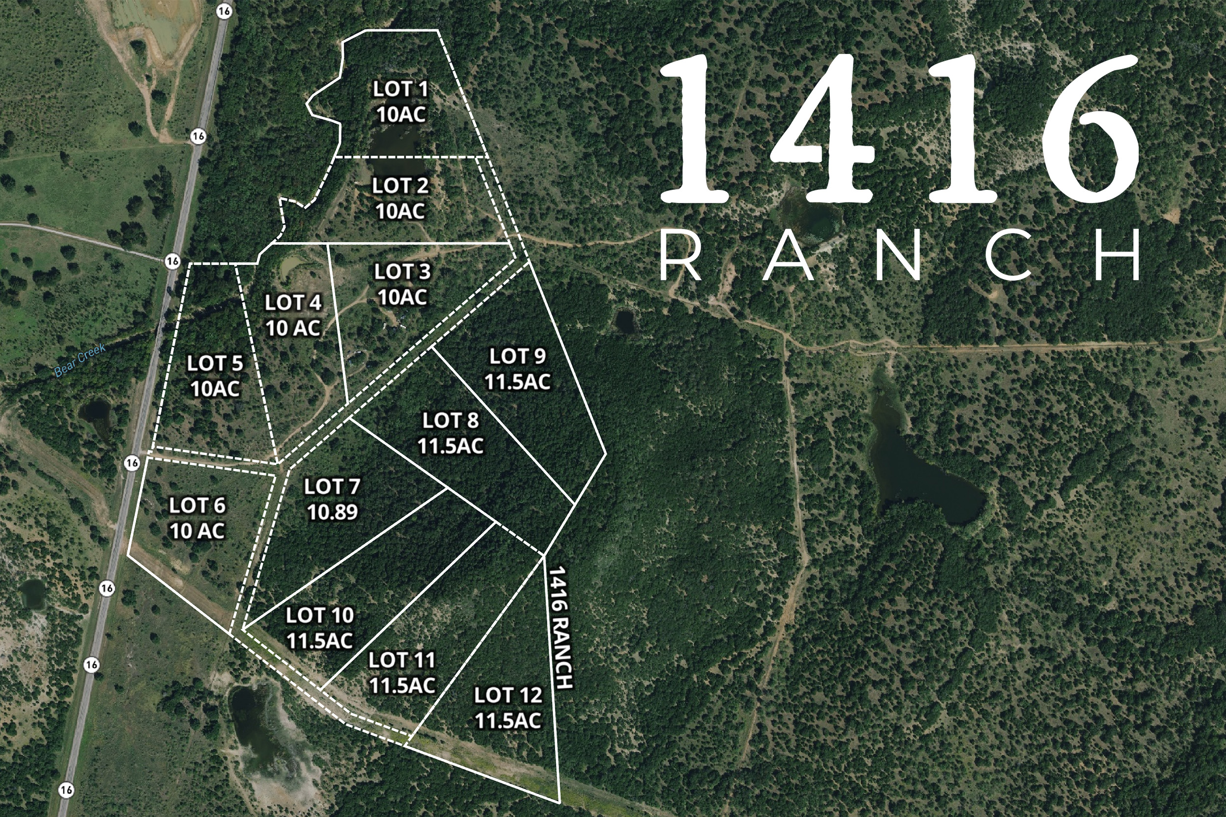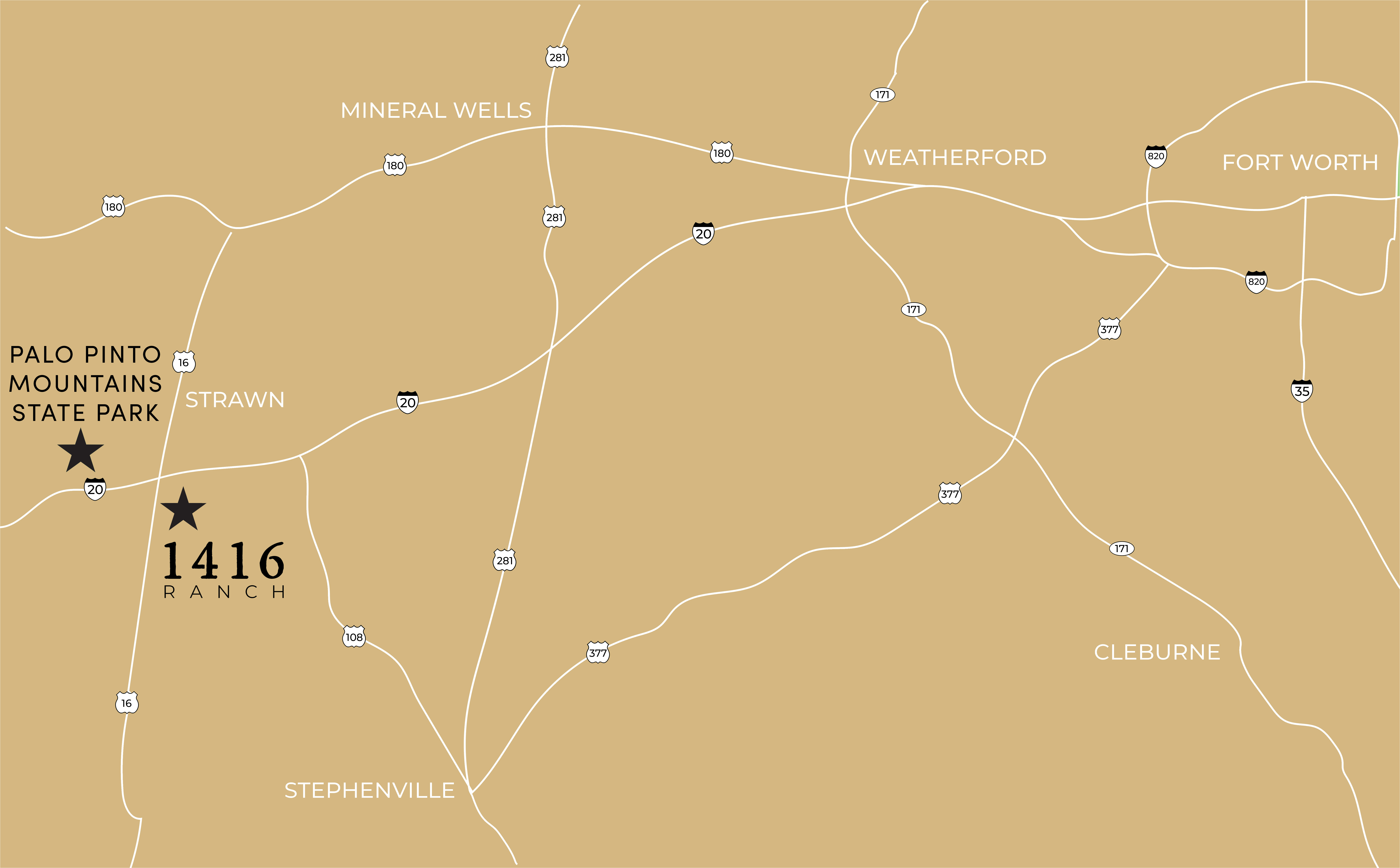 Located just 1.5 hours from DFW just south of 1-20 and the new Palo Pinto Mountains State Park on Highway 16, 1416 Ranch is the perfect ranchette community combining a private getaway feel with easy accessibility. 1416 offers various lot options ranging from 10 - 11.5 acres and a vast variety of topography options with some lots featuring 220'+ of elevation change & million dollar views of Ranger Hill, others offering soft roll & direct Hwy 16 access & some with access to picturesque Bear Creek & pond. ALL lots include hardwoods and a mix of mature cedars & mesquites. As you pull off Highway 16, an automatic gated entry provides security, privacy & hands-off access to your country retreat. The brand new rock road weaves throughout the community to each lot. The 150-acre community is comprised of 12 lots that can be bought separately or combined. Strawn water & electric available!