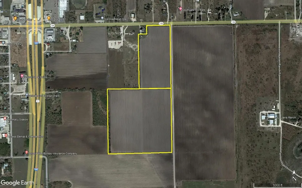 CONTRACT PENDING Level, irrigated farmland, within city limits of Raymondville, Tx. Paved road frontage on Hwy 186 (Hidalgo Ave.) Approx. 2 mins from expressway. Currently on Farm lease.