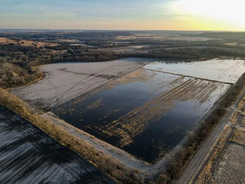Finished waterfowl properties are hard to find, and most never make it to the open market. This property is an excellent waterfowl property with a great deer and turkey component and a brand new spacious upscale Barndominium that makes for a sweet hunting lodge or cabin and really completes the property as a great recreational tract. With approximately 70 acres of precision graded flats encompassed in 4 impoundments, the construction of this property was designed to have ample food and water. The impoundments have year over year filled naturally with rainfall, but there are additional features that are in progress to possibly add some options on water availability. With flexibility at the forefront, the owner’s goal was to keep the property free of any encumbrances, and therefore this farm is void of any WRP, CREP, or government programs or easements. The farm is ultra flat and maintains the perfect soils of choice when the current owner set out to develop this property as a waterfowl haven. The current construction of the lodge style Barndominium building is approaching completion and is at a point that the new owners can still have time to make personal choices on the finishes that they choose to put on the final touches. The lodge has an outstanding layout with a high ceiling great room with fireplace and open kitchen area along with 3 bedrooms and spacious loft area. There is a large garage and also an additional open sided metal outbuilding for equipment storage. Along with the 70 acres of potential water habitat, there is also an additional approximate 100 acres of quality farm ground in which the tenant farmer cash rents, and he also is available to plant Japanese millet or food plots for the ducks or deer. Also, an outstanding deer area, the creek bed is lined with big mature timber, and there are several blocks of quality bedding areas to hold deer and turkeys. Another added benefit is access from two sides of the property while maintaining basically no road frontage. Kansas is no secret, but it has quietly been one of the best destinations for waterfowl over the last few years and will only continue to get better. If you are in the market for a precision property that is finished to perform at high expectations, than look no further. Please let us know if we can assist and provide an in person tour.