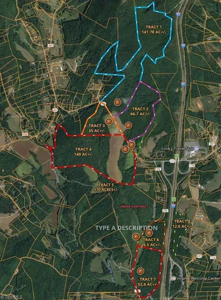 Great mini farm potential with approximately 10 acres of cultivated fields, lots of road frontage just on Interstate 77 exit 1. No restrictions. Buyer may adjust acreage and location. Buyer pays for new survey. part of a 639.89 acre+/- tract offered 8 ways or buy all. Seller is a NC Licensed RE Agent.
