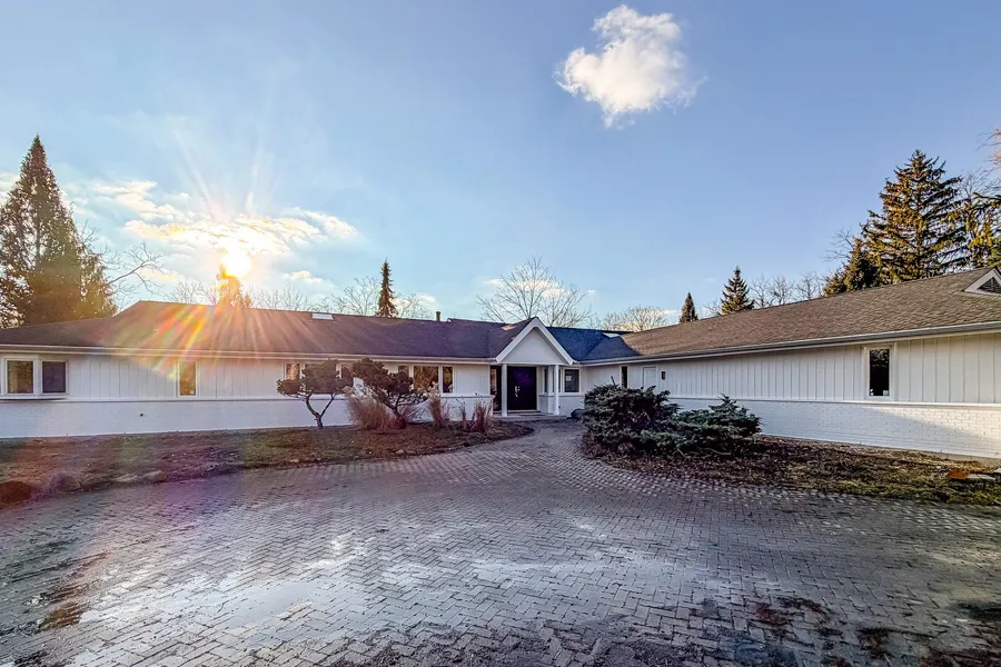 Will be completely upgraded throughout! This exceptional estate is truly one of a kind! Set back on nearly 5 private acres with a serene pond and mature trees, this sprawling ranch offers close to 4,000 sq. ft. of living space with 5 bedrooms, 3.1 baths, and a full basement. The chef's kitchen is a showstopper-featuring quartz countertops, a large island with breakfast bar, abundant white cabinetry, and a stunning skylight that fills the space with natural light. The inviting living room boasts vaulted ceilings, a striking fireplace, and access to the expansive deck-perfect for entertaining or relaxing outdoors. The open-concept dining room seamlessly connects the kitchen and living room, making it ideal for gatherings. The family room is surrounded by windows, creating a bright and airy atmosphere that enhances the home's spacious feel. Every bathroom has been beautifully updated with new vanities, flooring, and fixtures. The full basement offers endless possibilities for additional living space, recreation, or storage. Main level laundry adds everyday convenience. An attached 3-car garage and circular driveway completes this impressive property. Step outside, walk the grounds, and experience the peace and privacy this estate provides-you won't find another property like this at such an incredible value. Don't wait, this one won't last long!