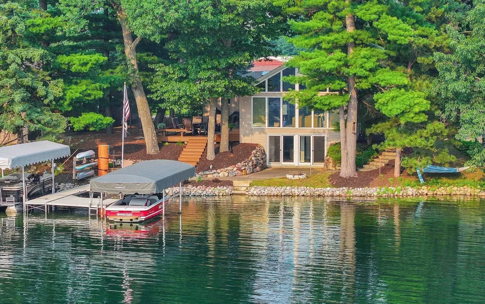 Nothing beats the Lake Lifestyle on Waupaca's Chain O' Lakes! Enjoy Sunset Views and 65 ft of firm, sandy frontage on Miner Lake. This beautifully updated 4BR, 3.5BA home offers a wall of windows that bring the lake right into your open-concept living, dining, and kitchen space. The Main floor features a private primary suite, second bedroom, fully updated bathroom, powder room and laundry. The fully renovated walk-out lower level includes 2 beds, an additional full bath, wet bar, and rec room opening to a patio with firepit. Enjoy lake life from the dock and expansive deck overlooking the sunset. Updates include new siding & gutters (2025), roof (2024), AC & water softener (2023), kitchen + appliances (2021), bathroom remodels, and more! Turnkey lake living at its finest!