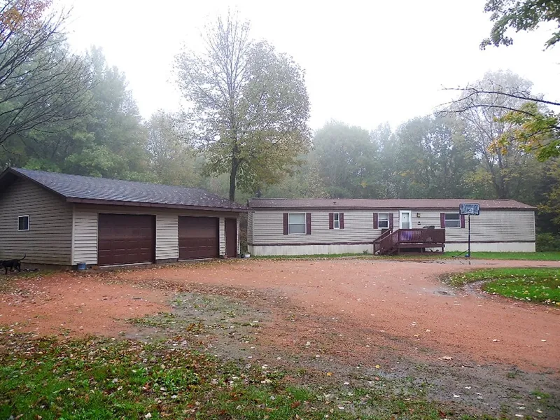 What a pretty setting!! Surrounded by 4 wooded acres, and set back off the road, with a nice circle drive entrance. This very well kept 2 bedroom manufactured home is waiting for you. Spacious kitchen, and laundry right by the master bedroom, just convenient. The garage is over sized, and plenty of room for toys. What an affordable way to live.