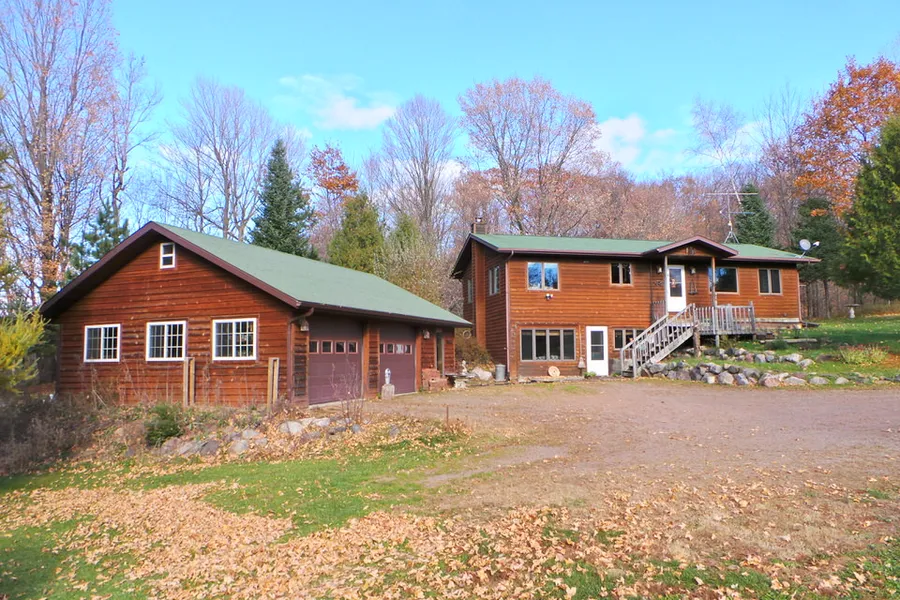 You will love the warm, cozy, inviting feel of this open concept rustic home. It has two bedrooms, bath, kitchen, dining, living room and office on the main floor. The lower level walk out is mostly finished. The 3 acre lot is gorgeous. It has rolling hills, large lawn and lots of trees and is very private. There is a detached 2 car garage. The lower level is mostly finished. It is partitioned, dry walled and ceiling is in the family room. There is a free-standing wood stove and walk out. It is sectioned for a family room, office area, utility room and bedroom.