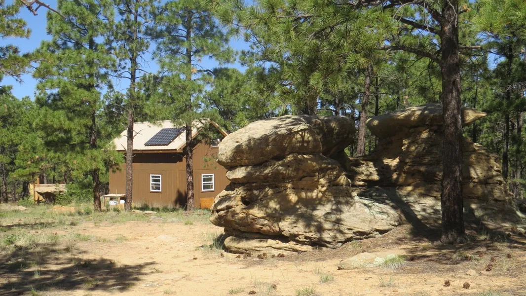 Main cabin has an 8 x 20 covered front porch, two 230 watt roof-mounted solar panels, composting toilet, wall-mounted propane heater, kitchenette, loft and second floor hammock. Outdoor heated shower and separate 12 x 12 shed also with its own solar power!