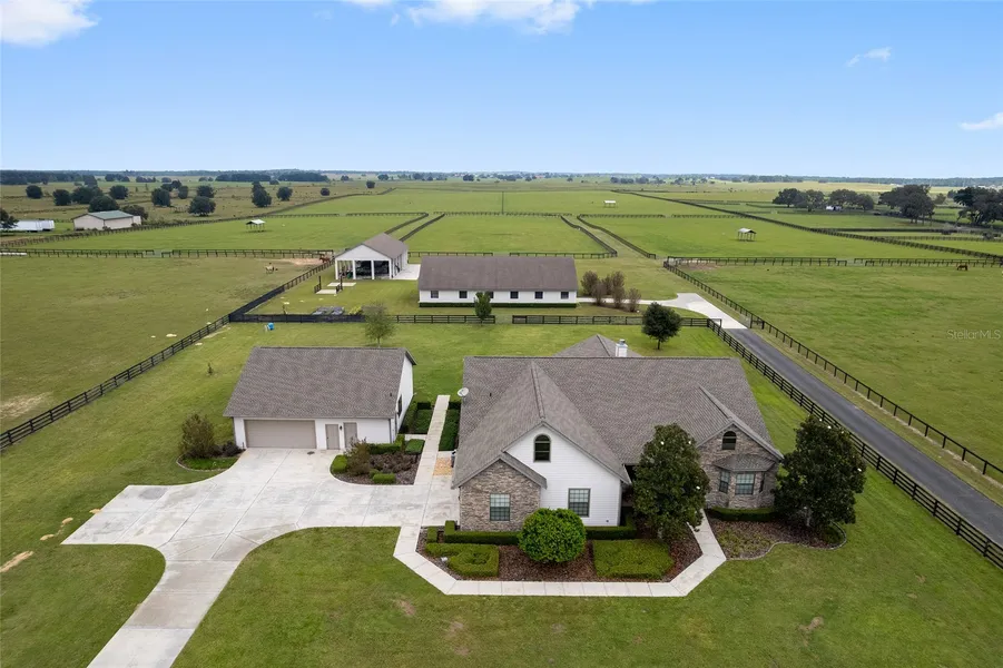 This turnkey 60-acre farm offers tranquility, top-tier amenities, and unmatched convenience. Under 10 minutes to the World Equestrian Center, 5 miles from Live Oak International, and 20 minutes from Ocala’s premier shopping and dining, The property is fully fenced with five paddocks, two large pastures, and five shade shelters. The immaculate center-aisle barn features 9 stalls, a full bath, feed/tack room, and wash rack. A spacious workshop with open bays and enclosed storage provides ample room for equipment and trailers. The custom three-bedroom home boasts wood floors, crown molding, and a stone fireplace, plus a chef’s kitchen with island seating, pantry, and wine fridge. The bonus room with wet bar and scenic views opens to a peaceful back patio — perfect for relaxing or entertaining. Move-in ready and ideally located, this property offers the best of Florida’s equestrian lifestyle.