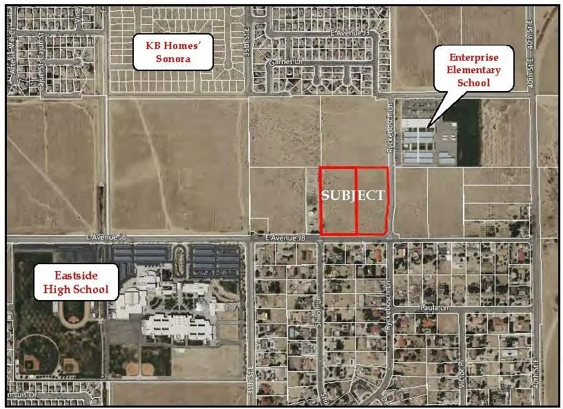 NWC E Avenue J8 and Ryckebosch Lane (aka 37th Street E), between 35th and 40th Streets E. Located in the path of growth, near KB Homes' new home community, schools, parks and shopping. Easy access to Highway 14, the Antelope and San Fernando Valleys and the Greater Los Angeles area. Zoned SRR. REDUCED TO $263,900!