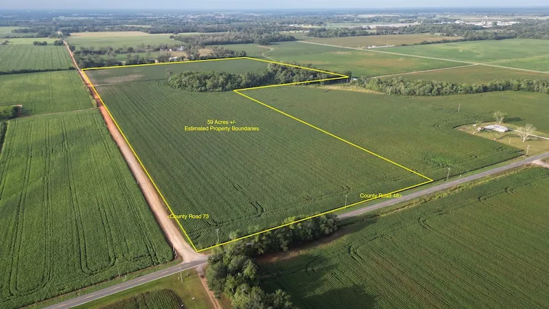 A beautiful tract of land that offers the potential for residential development, commercial uses, private residential or farming. The land is made up of an estimated 49 acres of open ground currently in row crop production with an estimated 10 acres of drain area with a mixture of timber. The property has an estimated 647 feet of paved road frontage along county road 48 on its north boundary and another estimated 2600 feet of dirt and gravel road frontage along county road 73 along its east boundary. There is power and city water along both county roads. This is an excellent area of convenience and growth, with nearby shopping centers, Walmart, Tractor Supply, and great county schools.