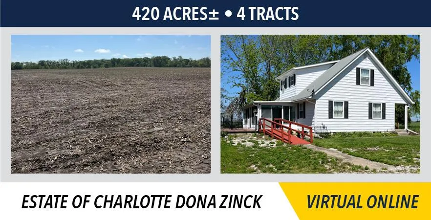 The Zinck farm real estate contains approximately 420 acres (subject to survey) to be sold in 4-tracts and is located in Washington County, IL.