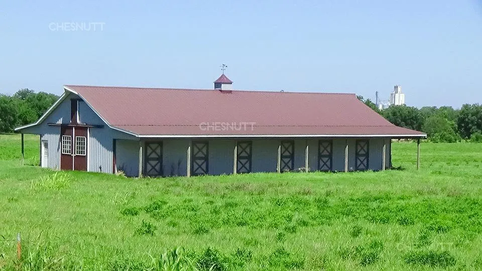 Late model horse barn with eight outside-accessible stalls, concrete central floor, tack room/office area, hay loft and half bath, at southwest corner of Oswego. Forty acres (m/l) of lush fenced pasture.