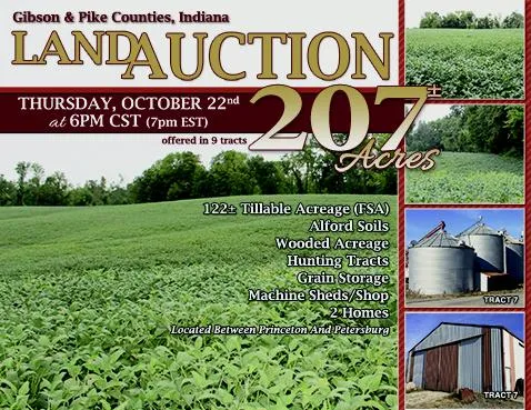 207+/- Acres offered in 9 Tracts 122+/- Tillable Acreage (FSA) Alford Soils Wooded Acreage Hunting Tracts Grain Storage Machine Sheds/Shop 2 Homes Located Between Princeton and Petersburg ONLINE BIDDING AVAILABLE