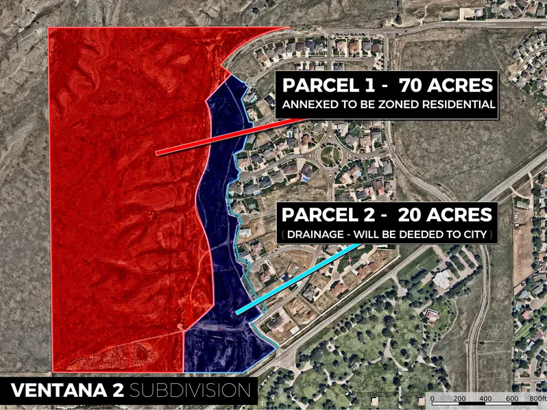 The second parcel is a 20-Acre Drainage parcel, which sits in the area in between the existing Ventana Filing #1 Subdivision, and the platted development area Ventana Filing #2. This parcel serves as a drainage area for the surrounding subdivisions. Within this parcel is a dedicated Park and irrigated field.