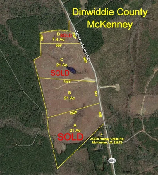 Parcel B 21 acres wooded in planted pine. Located less than 3 miles from I-85 McKenney exit. Agricultural zoning, conventional perc. Owner financing available. See website for terms.
