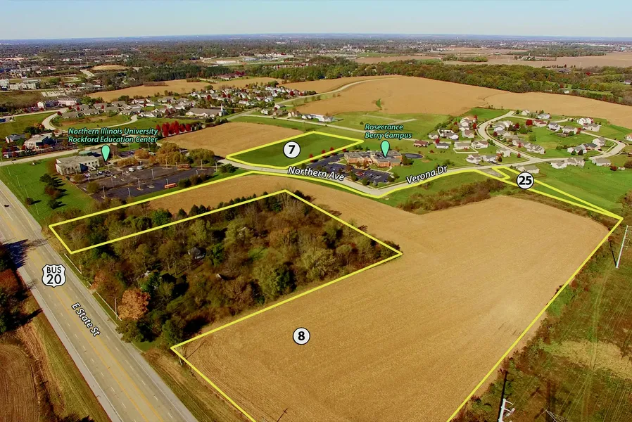 Tract 8: 19.0 ac of unplatted land Zoned - C3. This tract has frontage along E. State St. (Business U.S. 20), Northern Avenue and Verona Drive. The property is presently accessed from Northern Avenue and Verona Drive. Buyer would have to work with the Illinois Department of Transportation for future access to E. State St. (Business U.S. 20). Investigate the potential of this tract with its C3 - General Commercial zoning and road frontage. The majority of this tract was used for crop production in 2018.